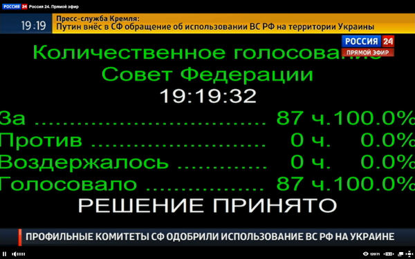 Olyckligtvis ökar spänningen på väg mot bristningsgränsen i Ukraina. Det ryska överhuset har nu med 100% för gett tillåtelse till President Putin att använda militär i Ukraina. Notera att detta är en tillåtelse och att beslutet har inte tagits ännu. Innan en eventuell insats skulle ske, skulle man rimligen se till att något som förefaller som en rimlig förevändning förekomma.