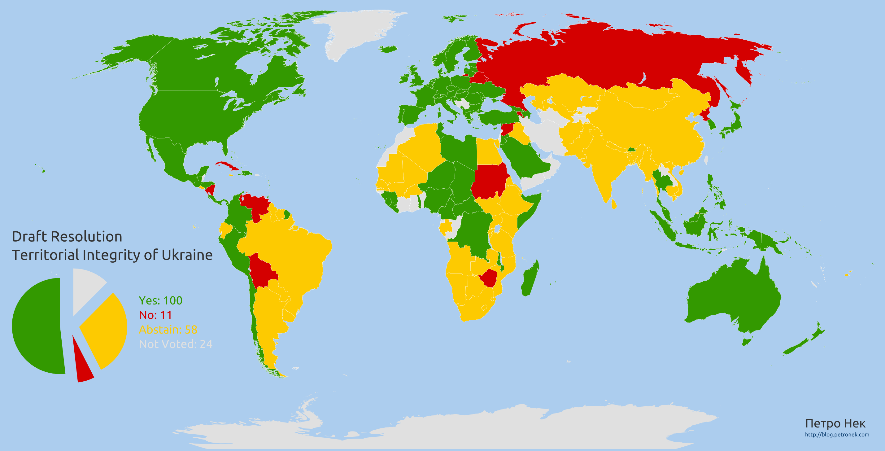 Men mest talande är kanske omröstningen i FN där enbart 100 länder ville säga definitivt att Ukraina, ett land de alla erkänt som självständigt enligt gällande gränser, var ett självständigt land enligt gällande gränser. 93 länder ville inte bekräfta detta och det är ett strategiskt problem i det långa loppet.