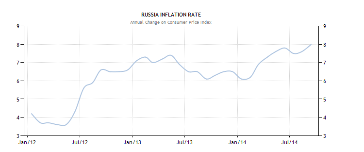 Ryssland är en instabil militärkoloss på lerfötter. Ett oljepris på $117-$119/fat behövs för att Ryssland ska finansiera sina offentliga utgifter, och nuvarande pris $92 är inte nära detta. I kriget i Ukrainas skugga har statsanställdas löner sänkts, pensioner konfiskerats och utgiftsposter plundrats för att hålla oligarkerna nöjda. Att lägga till ligger rubeln kring 40 per dollar vilket är 12,5% värre än förra peaken som var vid finanskrisen 2008. BNP-tillväxten för 2014 lär ligga på 0,2% samtidigt som inflationen ligger på 8% och obligationsräntorna är fortfarande mycket höga.