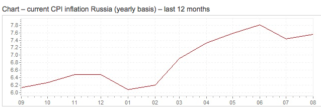 One of the most alarming indicators is that the Rouble is lower than ever. The coming years it is projected to be still around 0,1% which is very low when the inflation looks as the following (or actually the most recent is higher with 8,03%):