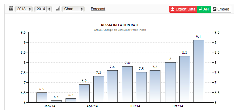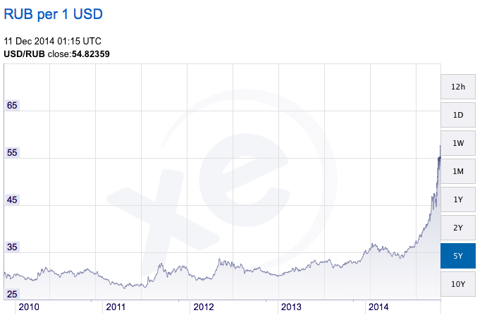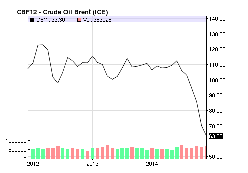 The single most important factor for the Russian economy is the oil price. To maintain Russia’s expenditure before the crisis, I saw calculations that they needed a price around $117/barrel and their public budget is based on the more modest price of $100/barrel. This morning, crude Brent dipped below $60 and the OPEC summit showed no signs of hindering this downfall. This can be compared to around $80/barrel when I wrote the last post six weeks ago.